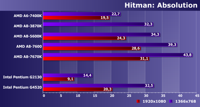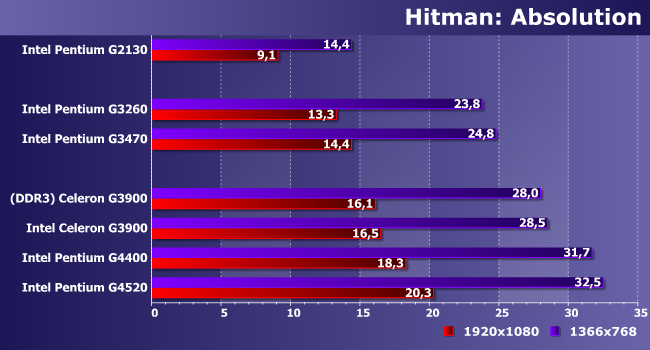 Hitman тоже «недолюбливает» двухпоточные процессоры, в результате чего снова между G4400 и G4520 разница не принципиальная, однако новые Pentium и с ним справляются хотя бы на минималках и в HD-разрешении — старым и до этого было далеко.
