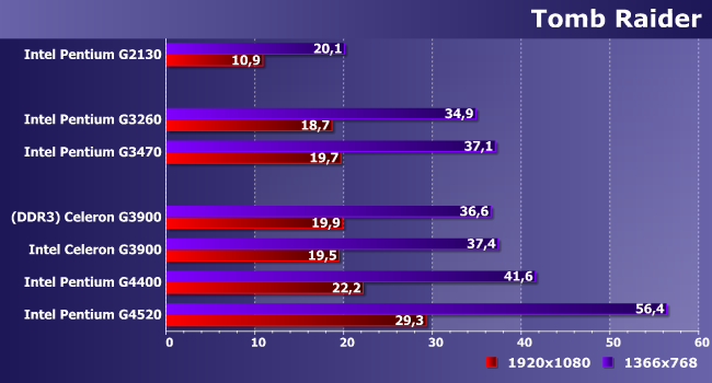 Зато Tomb Raider не требует чего-то выдающегося от процессорной части, так что тут уже различия качественные: если Pentium G4400 лишь немногим лучше предыдущих моделей семейства, то G4520 вплотную приблизился к «границе играбельности» в разрешении FHD. Фактически на практике можно его и использовать уже — все-таки эта граница не такая уж и четкая :)