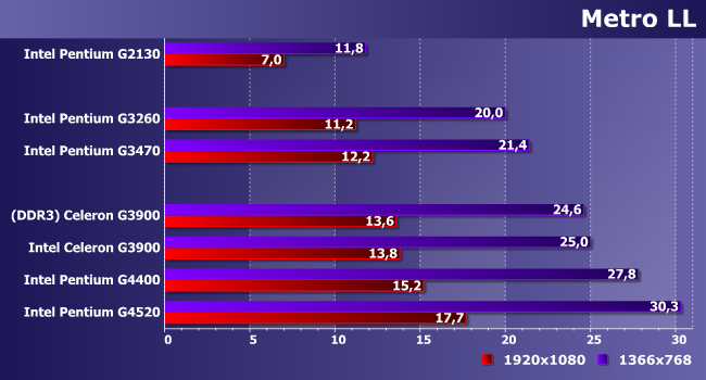 G4520 оказался также и первым Pentium, позволяющим хоть как-то поиграть в Metro: Last Light. Впрочем, судя по небольшой разнице между G4400 и G4520, Pentium ей вообще противопоказаны, причем с любой видеокартой, но в этом для нас ничего нового нет.