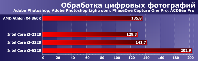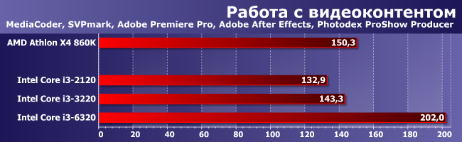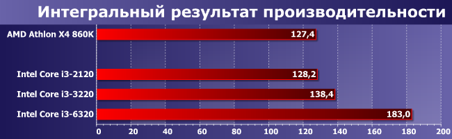 Производительность 2120 и 3220 различается на 10%, что можно было предсказать заранее: частота — одинаковая, поколения — соседние, видеокарта — дискретная. Отметим, при этом, что от Athlon X4 860K отстают оба. Core i3-6320, впрочем, далеко впереди, но это тоже предсказуемо — за последнюю пару лет частоты старших моделей семейства увеличились значительно, что сказалось бы даже без архитектурных изменений.