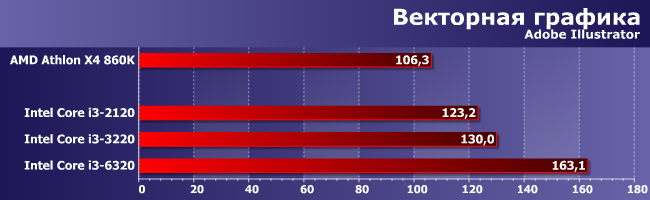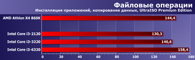 Кстати, и с файловыми операциями старая платформа Intel справляется хуже, чем новые или FM2+. Кроме того, перед нами до сих пор встречающийся случай, когда поддержка Hyper-Threаding только мешает — Pentium G2130 работал даже немного быстрее, чем имеющий чуть более высокую частоту i3-3220. Более старые процессоры же еще хуже — для компенсации отличий нужно еще большее преимущество в тактовой частоте. Но если вспомнить, что сравнительно с представителями новых платформ его обычно нет (а есть обратное), даже в таких вот «процессоронезависимых» (но часто встречающихся в жизни любого пользователя компьютера) ситуациях LGA1155 начинает выглядеть уже не лучшим образом. Хотя на практике, конечно, такому отставанию можно и не предавать значения.