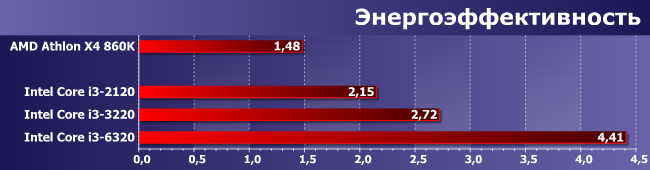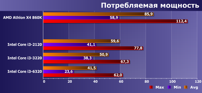 Впрочем, есть у FM2+ еще одно слабое место — довольно высокое энергопотребление. Intel от поколения к поколению его удавалось снижать, причем вопреки росту тактовых частот, а вот у AMD с этим не очень. Причем даже на отставание по техпроцессу такое положение дел не спишешь: напомним, что Athlon X4 860K изготовляется по нормам 28 нм, а Core i3-2120 — 32 нм.
