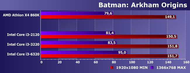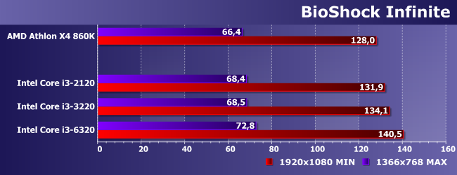 В Batman в режиме минимального качества всем расти уже некуда, в Bioshock некоторый резерв еще есть, но в основном разница между процессорами наблюдается лишь в режиме низкого разрешения с максимальным качеством. Впрочем, и она-то невелика. Явно выделяется только Core i3-6320, но он всегда это делает.