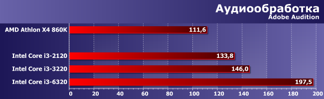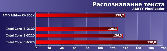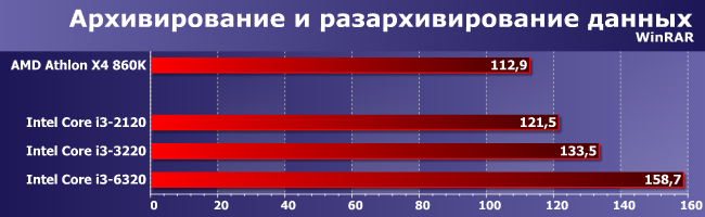 Поддержка высокочастотной памяти сама по себе еще не ключ к однозначному успеху. Впрочем, сжатие данных 860К выполняет с той же скоростью, что и i3-2120, а вот в однопоточной распаковке отстает даже от него. В итоге проигрывает всем, но не так уж и значительно. Тем более, в WinRAR и превосходство 6320 над старыми процессорами куда менее убедительное, чем во многих других случаях.