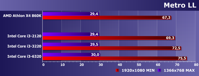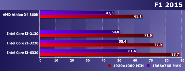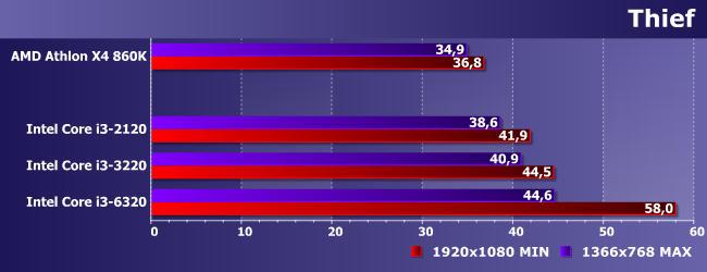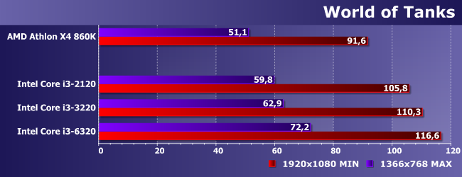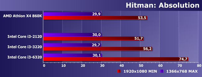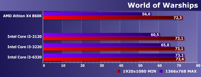 Как уже было отмечено в предыдущей статье, больше примерно 73 кадров в секунду получить в этой игре невозможно, что с данной видеокартой в режиме минимальных настроек выполняется практически всегда и для любого процессора. А вот максимальные настройки пусть даже в сниженном разрешении — уже более сложная задача, с которой из испытуемых полностью справился только Core i3-6320. Остальные же медленнее, а разница между Athlon X4 860K и Core i3-2120 вообще становится пренебрежимой.