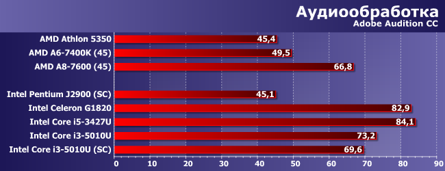 Audition не слишком активно использует многопоточность, так что главной здесь является однопоточная производительность, которая максимальна у настольного Celeron и (благодаря Turbo Boost) мобильного Core i5. Но нельзя сказать, что наш новичок выглядит совсем уж плохо — лучше, чем можно было бы предположить, глядя на его частоту во всяком случае :)