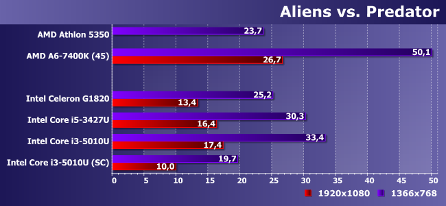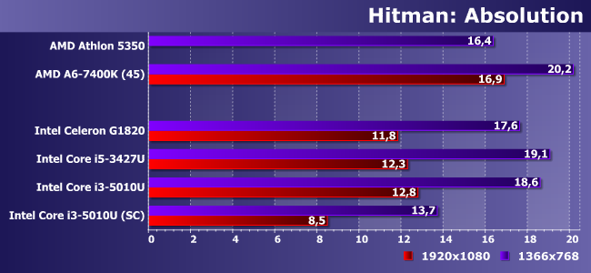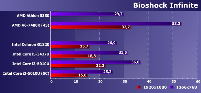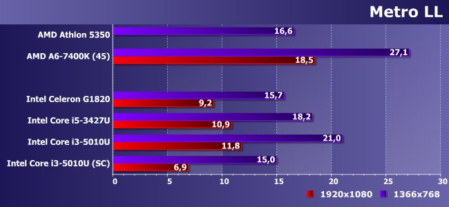 Производительность по сравнению с Ivy Bridge увеличилась на 10%, что позволило немного отдалиться от границы комфортности, да и вообще — это всяко лучше любых Celeron/Pentium. Если... если память работает в двухканальном режиме. В противном случае результаты даже хуже, чем у Athlon 5350, а абсолютная величина падения — почти два раза, т. е. дело дошло до того, что даже в CULV-процессорах Intel лимитирующим производительность GPU фактором оказывается ПСП.