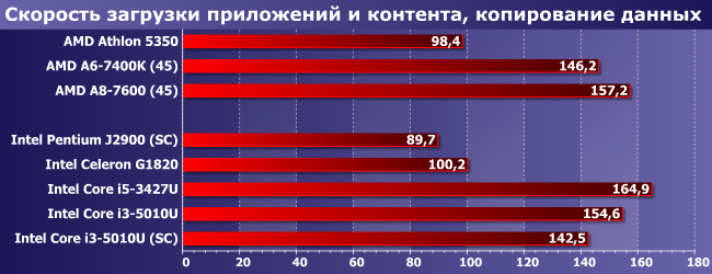 Вот здесь уже отставание от Core i5-3427U заметно, поскольку последний нередко (и успешно) использует турбо-режим, а все Core i3 такового по-прежнему лишены. Но догнать по производительности Celeron G1820 по крайней мере удается. Обогнать в полтора раза суррогатные платформы и бюджетные одномодульные процессоры AMD — тоже.