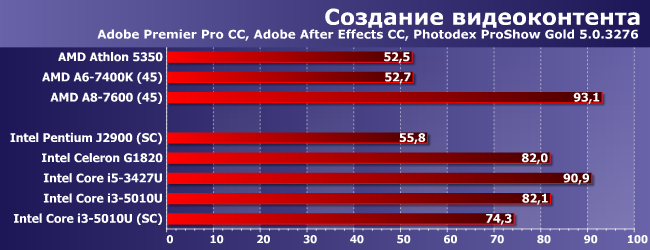 Некоторые фильтры Photoshop активно используют OpenCL, а видеоядро в новом поколении Core в очередной раз улучшилось, и в итоге Core i3-5010U сумел обогнать даже Core i5-3427U и A8-7600. Что ж — Photoshop на ультрабуке вполне возможен :) Заметим, что ослабление системы памяти здесь приводит к драматическому снижению результатов, однако в первую очередь это связано с объемом, а не производительностью: все-таки 4 ГБ для многих фильтров маловато. Но даже в таких (равных) условиях Core i3-5010U обгоняет суррогатные платформы в полтора раза и выходит на уровень «нормально укомплектованных» А4/А6.