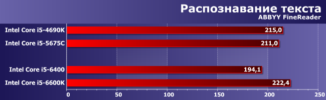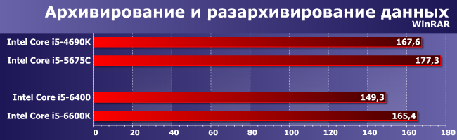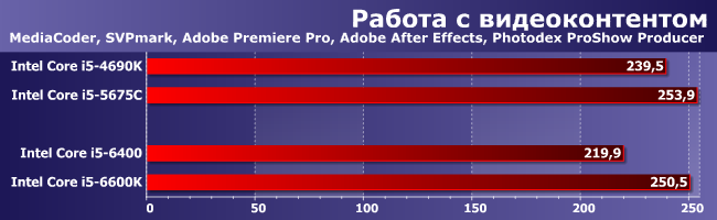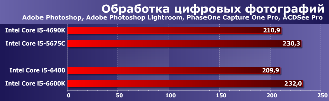 Равно как и группа приложений для работы с фотографиями. Впрочем, в ней наблюдается полное торжество Skylake — даже не потому, что 6600К оказался самым быстрым, а потому, что и самый медленный в семействе Core i5-6400 подобрался вплотную к 4690К, который официально был самым быстрым Core i5 еще всего год назад. В общем, у нас все больше укрепляется подозрение, что специфика последних лет (и основных целей при разработке новых микроархитектур) способны принести основные бенифиции покупателям настольных процессоров среднего уровня. Или бюджетных. А вот топовый сегмент обновляется лишь постольку-поскольку, и старшие модели Core i5 это тоже уже задевает.
