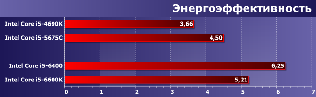 Соответственно, если с диаграммы убрать результаты Core i5-6400 — видим красивую и ровную лесенку с примерно равными ступеньками, соответствующими смене поколений. Для i5-5675С даже выигрышную, но за счет смены техпроцесса. Однако стоит учесть не только старшие, но и младшие процессоры для LGA1151, как внезапно оказывается, что и не меняя нормы производства можно достичь очень хороших результатов, если не слишком гнаться за производительностью. Собственно, что и сделало старшие модели Broadwell нишевым решением буквально сразу: практическая готовность более эффективной новой микроархитектуры не оставляла этим процессорам шансов на долгую и счастливую жизнь.