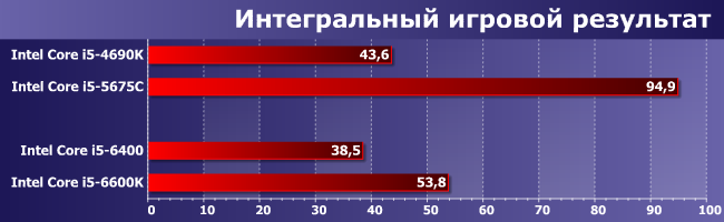 Равно как и в этом случае. Собственно, с учетом сходства процессоров по организации, ничего удивительного нет и в том, что на разном коде они ведут себя примерно одинаково. Существенно отличается от прочих i5-5675C, но двояким образом: L4 и GPU тянут его вперед, где это возможно, а вот более низкие, нежели у двух других топов частоты — назад и всегда. Конечный результат в его случае может меняться в пределах диапазона 4690К— 6600К. А в особых ситуациях — и выходить за него.