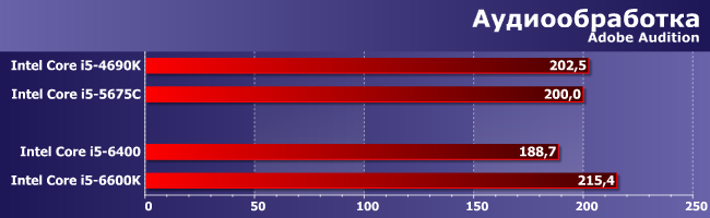 Вот сразу и ситуация, возможность которой была озвучена чуть выше — самым быстрым Core i5 оказался 5675С. Впрочем, нельзя сказать, что его преимущество так уж велико, во-первых. Во-вторых, оно будет меньшим при использовании дискретной видеокарты — эти программы GPU иногда худо-бедно используют.
