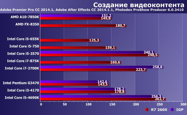 Что касается ориентиров для сравнения, то особого выбора у нас не было: пусть в большинстве тестов (за исключением игровых, естественно) конкретная видеокарта и не имеет существенного значения, но лучше обойтись без приблизительных оценок, когда есть возможность дать точные. Тем более что набор процессоров, протестированных с Radeon R7 260X в прошлый раз, уже достаточно представителен, так что мы взяли по одному современному Pentium, Core i3 и Core i5 и два процессора AMD: AMD A10-7850K и AMD FX-8350.