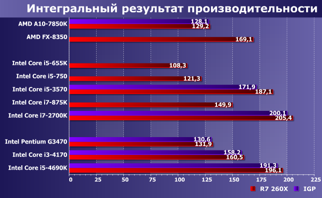 Отметим, что в первом бенчмарке процессоры с интегрированным графическим ядром тестировались два раза: с использованием его и дискретного Radeon R7 260X (кроме Core i5-655K — как уже было сказано выше, его графика не поддерживается используемой нами ОС). А вот игровые тесты проводились только с дискретной видеокартой. Как обычно, для них мы ограничились только режимом минимального качества (для максимальных настроек этой видеокарты самой по себе недостаточно), но в полном разрешении Full HD (с этим-то она, в отличие от многих интегрированных решений, отлично справляется).