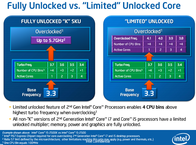 Платами на Р67 поддерживается и «Fully Unlocked Core», позволяющая в любом режиме использовать множитель вплоть до 57. Однако для этого нужен уже процессор K-серии. Отметим, что интересны они не только любителям разгона (а может и не столько им: как показано выше, добавить 700—800 МГц можно и на обычных процессорах): в K-серии используется видеоядро серии HD 3000, а вот в обычных моделях — всего лишь HD 2000, в котором отключена половина исполнительных модулей. Таким образом, эти процессоры будут крайне полезны и любителям интегрированной графики, которые будут использовать их на платах на чипсете H67. А вот на P67 задействовать встроенное видеоядро не получится (поскольку нет в нем линка FDI), зато в полной мере можно будет «оттянуться» при разгоне, о чем сказано выше. Причем при разгоне не только ядер, но и памяти: несмотря на то, что официально поддерживаемым максимальным режимом является DDR3-1333, это верно только для Н67. На Р67 же доступны и более высокие множители, что дает частоты памяти вплоть до 2133 МГц. Да и уровень TDP на этих платах можно настраивать вручную, повышая его при разгоне или, наоборот, снижая для экономии энергии (что ранее было доступно только для экстремальных процессоров). В общем, разрабатывая процессоры и чипсеты для LGA1155, компания Intel учла весь прошлый опыт, наведя порядок и в их сравнительном позиционировании :)