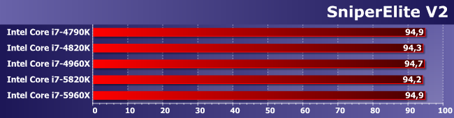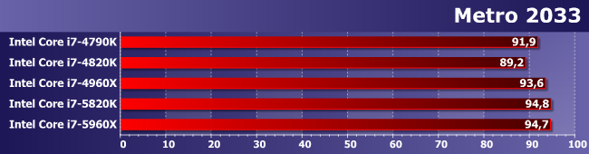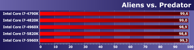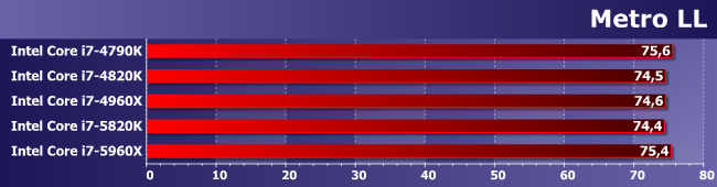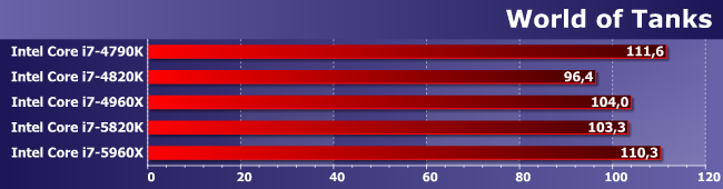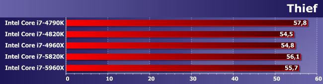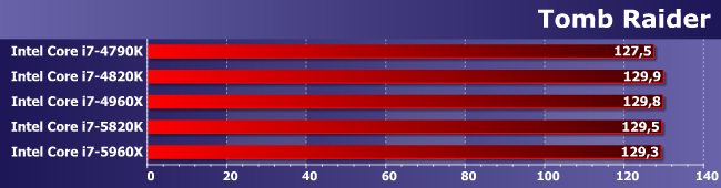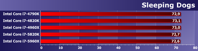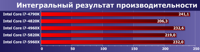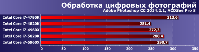 Зато здесь именно увеличение количества ядер является определяющим фактором. И (что характерно) 5820К и 4960Х примерно равны — второй раз уже и снова в условиях, благоприятных для шестиядерных процессоров.