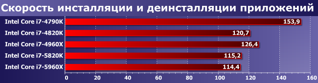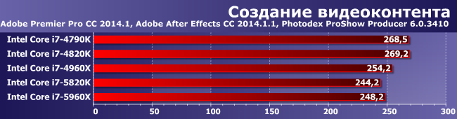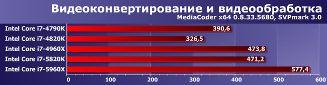 Пожалуй, самая лучшая для демонстрации преимуществ многопоточности диаграмма, поскольку эти приложения используют столько ядер процессора, сколько найдут. В итоге убедительная победа 5960Х — 4790К он обогнал в полтора раза. Стоит, правда, раза в три больше, но это дело обычное: зависимость цены и производительности далеко не линейная. Оба шестиядерника между ними, причем примерно равны — с учетом разных цен это весьма немаловажно. 4820К же явный аутсайдер — у него все параметры хуже, чем у 4790К :)