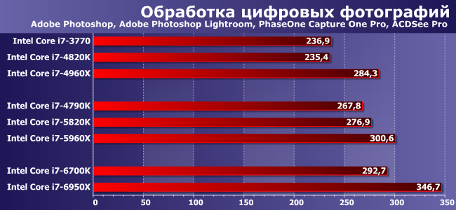 | Процессор | Intel Core i7-4820K | Intel Core i7-4960X | Intel Core i7-5820K | Intel Core i7-5960X | Intel Core i7-6950X |