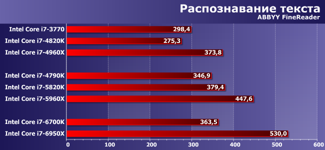 Сжатие данных хорошо распараллеливается, обратный процесс — однопоточный. Благодаря второму современные топовые «квады» в общем итоге легко обгоняют младшие или старые шестиядерные процессоры. Благодаря первому — Core i7-6950X лучший. Хотя и победа не столь уж убедительна — менее 25% при большем в 2,5 раза количестве ядер. Но, в общем, понятно, что для тех, кто ежедневно архивирует сотни гигабайт информации — выбора нет. Встретите таких — познакомьте ;)