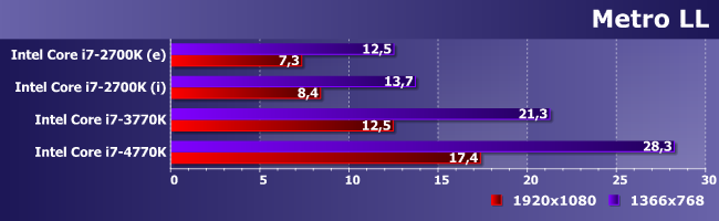 Чего не скажешь про Metro — только Haswell приблизился к приемлемой частоте кадров, и только в низком разрешении.