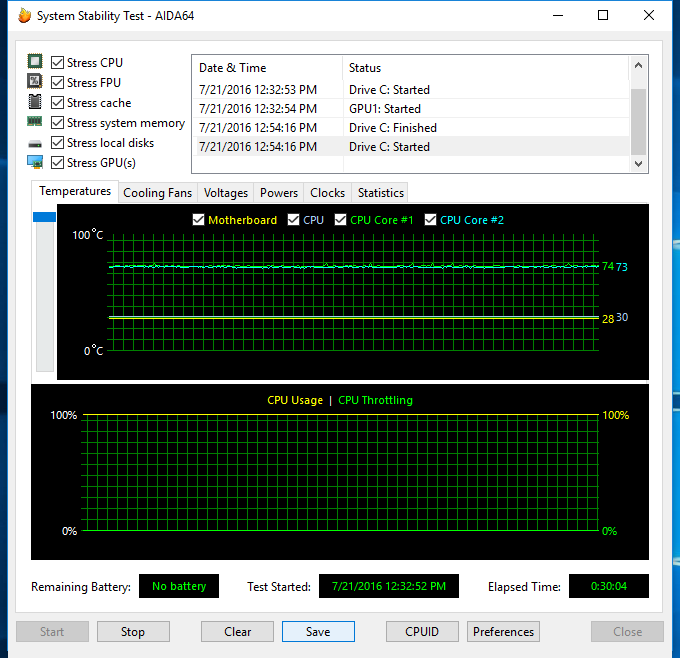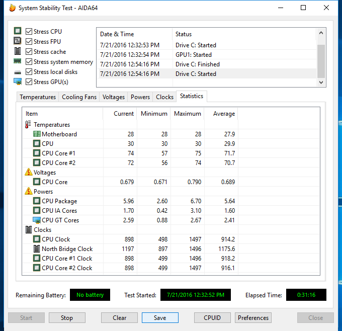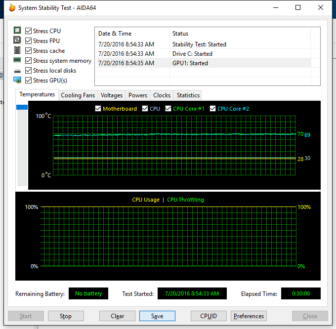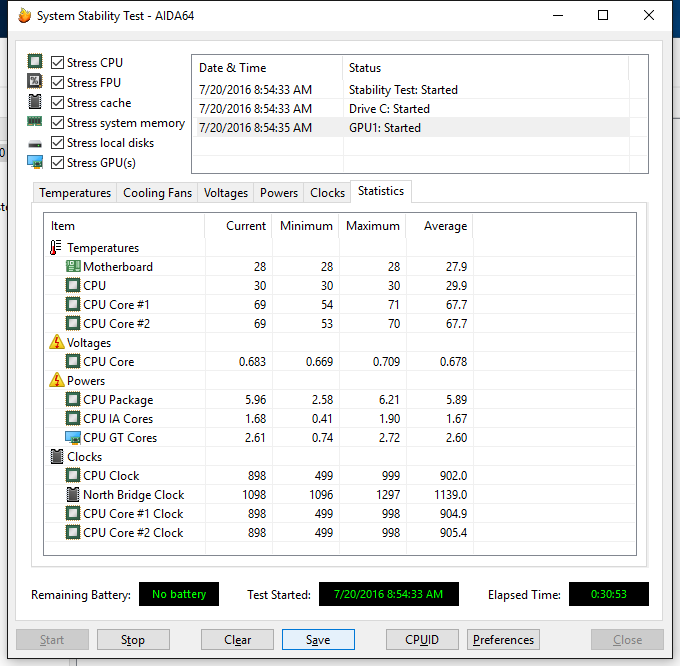 Для начала оценим эффективность систем охлаждения новинок. Отметим, что напрямую сравнить уровень энергопотребления платформы с прошлым поколением не получится, поскольку в спецификациях для Intel Atom указывается величина SDP, а для Intel Core M — TDP. Впрочем, учитывая, что корпуса одинаковые, блоки питания похожие, да и вентиляторы, вероятно, тоже, можно говорить, что и по этому параметру устройства близки. Напомним, что в прошлых материалах мы отмечали, что установка активной системы охлаждения (с вентилятором), с одной стороны, позволяет избежать перегрева, а с другой — добавляет в конструкцию движущиеся элементы, которые могут требовать регулярного обслуживания. Нагрузка создавалась получасовым стресс-тестом утилиты AIDA64 для всех компонентов.