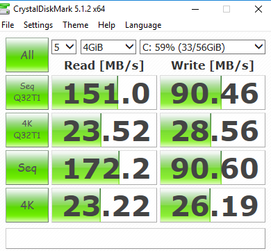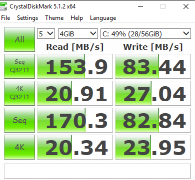 Для подобного компактного устройства системный накопитель показывает неплохие результаты — чтение на уровне 150 МБ/с и запись на 80-90 МБ/с. По сравнению с прошлым поколением цифры незначительно подросли. Напомним, что в данном случае используется шина eMMC.