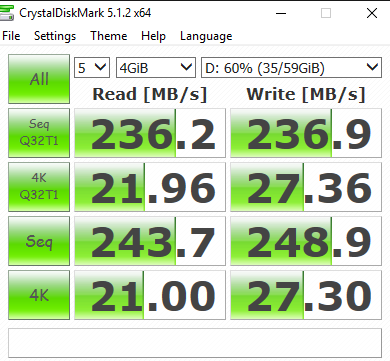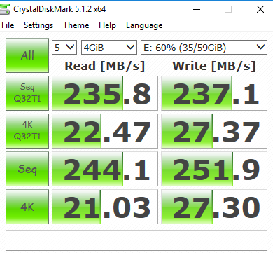 Скорость работы с USB 3.0 в новых компьютерах также немного выросла и превышает 230 МБ/с на последовательных операциях. Это позволит вам при необходимости существенно увеличить объем доступных для работы документов, не теряя в скорости. Можно даже сказать, что внешний диск сможет обеспечить более высокий комфорт. Отметим, что при подключении SSD к порту USB 3.0 на блоке питания результаты меняются мало.