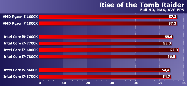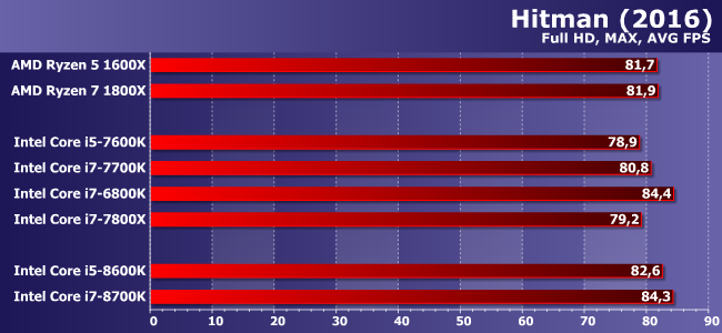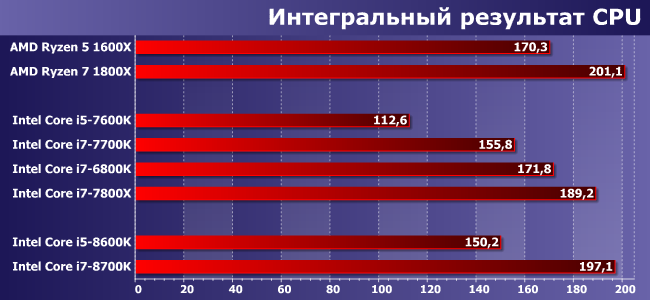 Расклад почти повторяется, только здесь уже Core i7-8700K не отстал и от 1800Х. Отличный результат в верхнем сегменте! И похуже — в среднем: Ryzen 5 1600X продолжает оставаться привлекательным при использовании дискретной видеокарты. С другой стороны, можно рассчитывать на то, что после появления недорогих плат какой-нибудь Core i5-8400 отлично подойдет тому, кому быстрая графика не нужна — ему-то, по сути, вообще не с кем будет конкурировать в таком раскладе :)