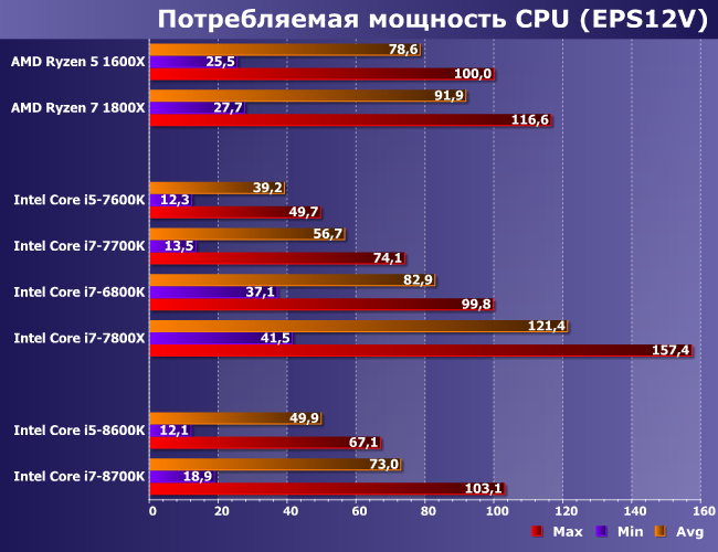 Впрочем, производительность и цена — не единственные характеристики процессора, а в плане энергопотребления Core i5-8600K как раз смотрится отлично: он практически идентичен предшественнику. Энергопотребление же Core i7-8700K несколько выше, чем хотелось бы.