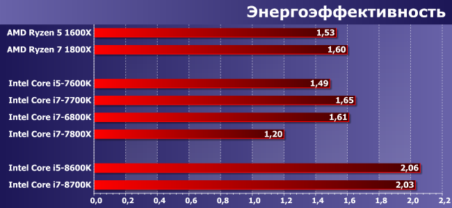 А вот от Core i5-8600K мы хотели бы более высокой производительности, поскольку сейчас энергоэффективность новой пары процессоров примерно равна. И все же у Core i5 она чуть лучше, что тоже косвенно намекает на определенные проблемы у этой модели Core i7 (или у нашего экземпляра) — ранее использование SMT ее улучшало, а не наоборот. Впрочем, это придирки — все равно оба этих процессора абсолютные лидеры из протестированных на данный момент. И конкурентов… не наблюдается :)