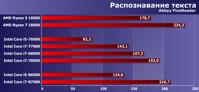 Есть ощущение, что разок «сыграл» четырехканальный контроллер памяти — во всяком случае, чем-либо иным такой успех i7-6800K объяснить сложно. Но i7-8700K отстает от него незначительно, а вот сам опережает Ryzen 7 1800X, замыкающий тройку лидеров, довольно заметно. У этой программы, возможно, есть резерв для улучшения работы с новыми процессорами, что позволит i7-7800Х и Ryzen демонстрировать более высокий результат. Впрочем, и так положение дел с архивированием благоприятно для новичков, хотя своих непосредственных предшественников они не слишком обгоняют.