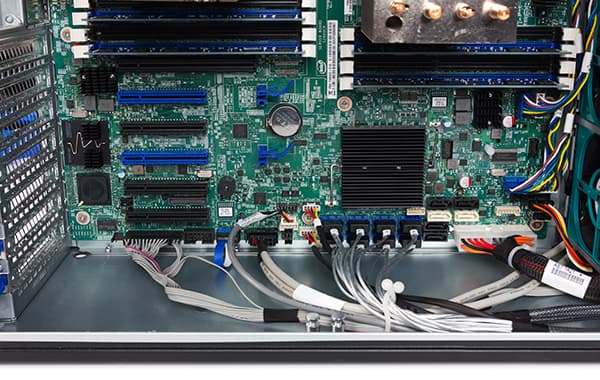 Таким образом, какую-нибудь короткую видеокарту, типа Nvidia Quadro 600 (мы пробовали и с ней), установить можно, а вот Nvidia Quadro K5200 в отведенном пространстве уже не умещается. Впрочем, эта проблема решается, поскольку среди слотов с форм-фактором PCI Express х8 есть слоты с открытым концом. В итоге видеокарту Nvidia Quadro K5200 мы в эту систему установили, но с учетом того, что она будет работать в режиме x8, а не в режиме х16.