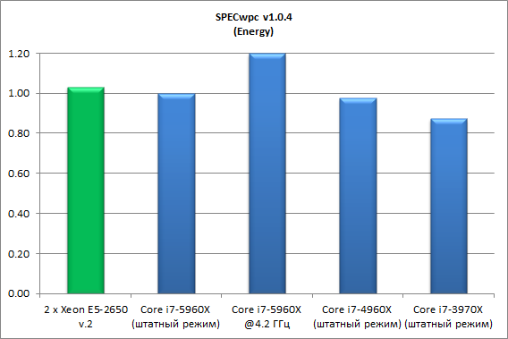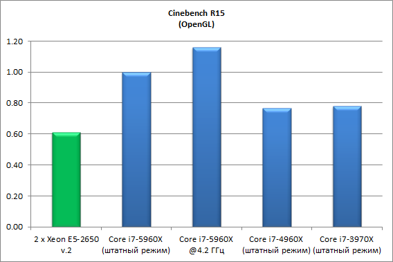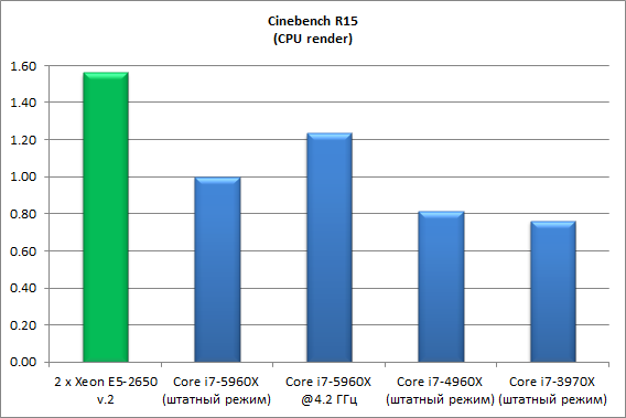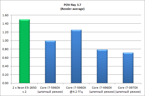 | Тест | 2 × Xeon E5-2650 v.2 | Core i7-5960X (штатный режим) | Core i7-5960X @4.2 ГГц | Core i7-4960X (штатный режим) | Core i7-3970X (штатный режим) |