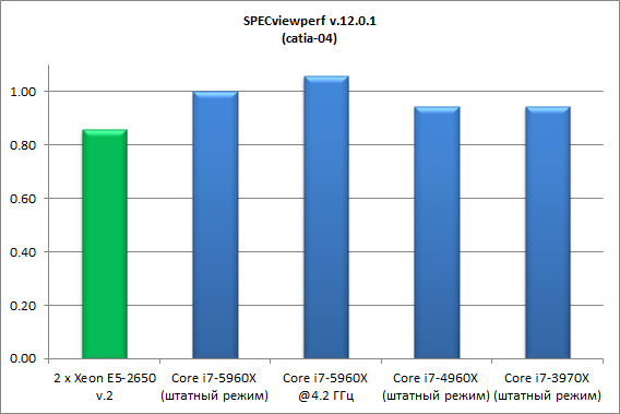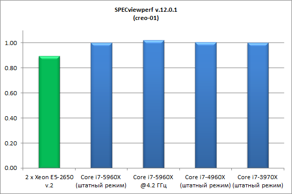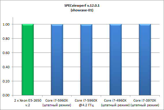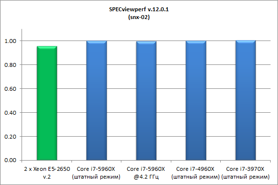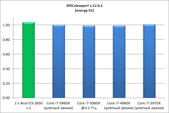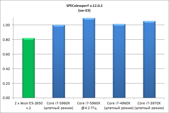 В тестах пакета SPECviewperf v.12.0.1 результаты для всех конфигураций примерно одинаковы, хотя в большинстве тестов двухпроцессорная рабочая станция немного уступает всем остальным конфигурациям. Вообще же нужно отметить, что пакет SPECviewperf v.12.0.1 в большей степени ориентирован на тестирование именно видеокарты, и возможно, для процессоров его результаты не очень показательны.