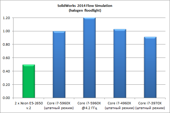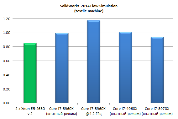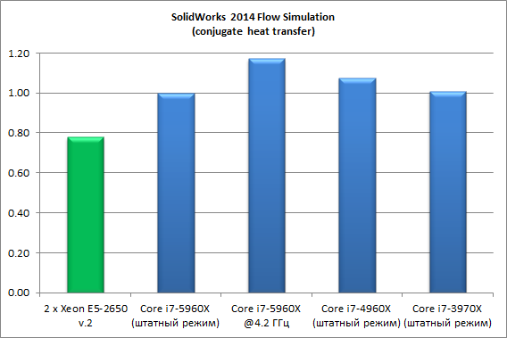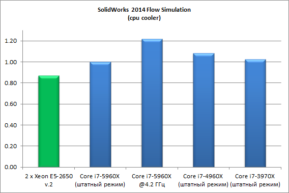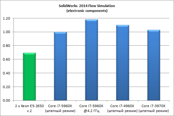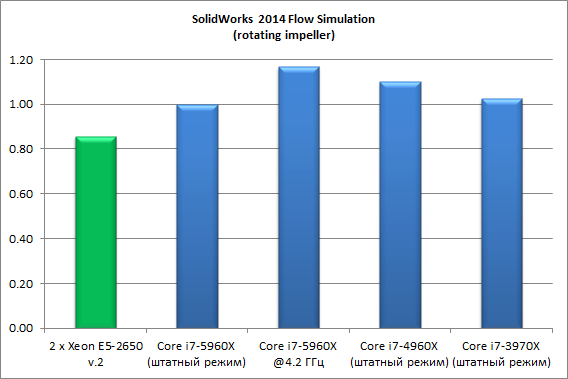 В гидро/аэродинамических и тепловых расчетах в пакете Dassault SolidWorks 2014 SP3 c модулем Flow Simulation результаты во всех тестах очень схожи. По времени расчета лидером является система на базе процессора Core i7-5960X в разогнанном состоянии. Далее следует система на базе процессора Core i7-4960X. Третье место делят между собой системы на базе процессора Core i7-5960X (в штатном режиме работы) и процессора Core i7-3970X. Ну а на последнем месте оказалась рабочая станция на базе двух процессоров Xeon E5-2650 v.2.