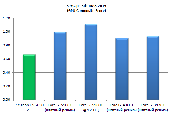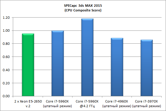 В тесте SPECapc 3ds for max 2015 двухпроцессорная рабочая станция уступила однопроцессорной системе на базе Core i7-5960X по всем показателям. Одним словом, для трехмерного моделирования в приложении Autodesk 3ds max 2015 нет никакого смысла в использовании двухпроцессорной системы на базе Xeon E5-2650 v.2.