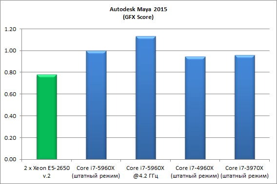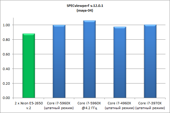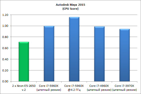 В этом тесте двухпроцессорная рабочая станция опять проиграла однопроцессорной системе на базе Core i7-5960X (и всем остальным системам). То есть и для пакета Autodesk Maya 2015 нет смысла в использовании двухпроцессорной системы.