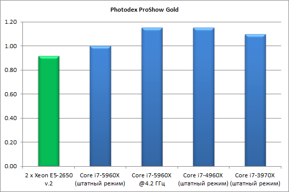 В тесте на основе приложения Photodex ProShow Gold 5.0.3276 (создание анимированного слайд-шоу) двухпроцессорная рабочая станция проигрывает всем остальным конфигурациям. В данном тесте важнее не количество ядер, а тактовая частота.