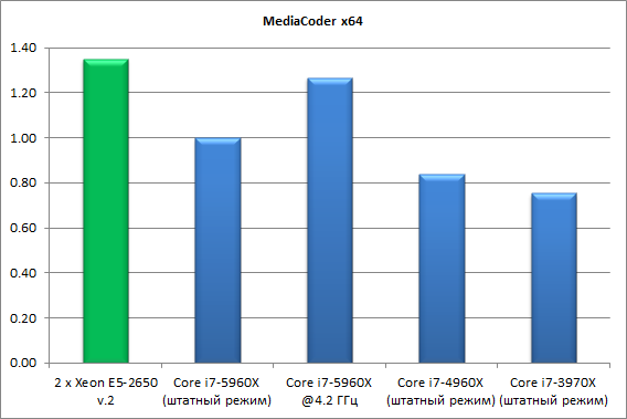 В тесте транскодирования видео с использованием утилиты MediaCoder x64 0.8.25.5560 лидером является двухпроцессорная графическая станция. Она почти на 35% опережает по скорости транскодирования компьютер с процессором Intel Core i7-5960X. Тем не менее, в состоянии разгона один процессор Core i7-5960X почти догоняет по скорости транскодирования два процессора Xeon E5-2650 v.2.