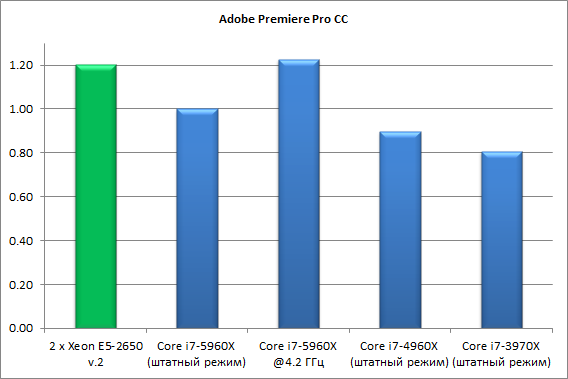 Вообще, говоря о таких пакетах, как Adobe After Effects CC и Adobe Premiere Pro CC, стоит отметить, что результаты наших тестов, возможно, и не вполне объективны — в том смысле, что можно сделать тест, который в большей степени будет зависеть от количества ядер процессора. Впрочем, можно создать и тест, который бы в большей степени переносил вычисления на GPU. У нас изначально не стояла задача продемонстрировать преимущество многоядерных процессоров или преимущества мощной графики — мы просто взяли реальные проекты. Поэтому вывод в данном случае можно сделать такой: не во всех проектах Adobe After Effects CC и Adobe Premiere Pro CC два процессора Xeon E5-2650 v.2 (общее количество логических ядер 32) позволяют получить весомое преимущество над однопроцессорной системой с процессором Core i7-5960X (общее количество логических ядер 16).
