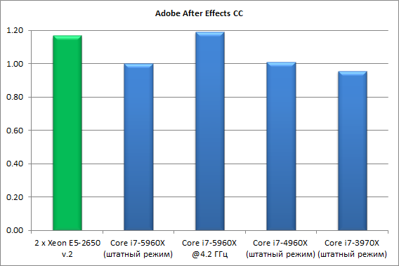 В приложении Adobe After Effects CC результат аналогичный. В штатном режиме двухпроцессорная рабочая станция опережает систему на базе процессора Core i7-5960X почти на 20%, а при разгоне Core i7-5960X система на его основе не только догоняет, но и немного превосходит двухпроцессорную рабочую станцию.
