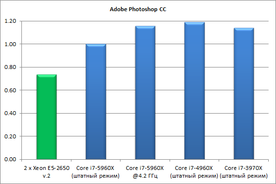 В приложении Adobe Photoshop CC получается примерно аналогичный результат. В этом приложении два процессора Xeon E5-2650 примерно на 25% уступают по скорости обработки фотографий процессору Core i7-5960X в штатном режиме работы. Впрочем, это и понятно. Как мы уже демонстрировали в предыдущей статье, посвященной процессору Core i7-5960X, Adobe Photoshop CC эффективно может использовать только шесть ядер процессора (12 логических ядер). Ну а при 32 логических ядер все только тормозится.
