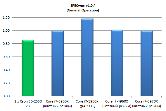 Ну а теперь обратимся к результатам наших тестов. Для наглядности мы приведем результаты тестов и в виде таблиц, и в нормированном виде на диаграммах. Нормировку мы проводили относительно процессора Intel Core i7-5960X в штатном режиме работы. В таблицах результаты отражены в тех единицах измерения, в которых они получаются в тестах. Причем поскольку некоторые тесты (SPECapc for 3ds max 2015 и SPECwpc v1.0.4) выдают очень много результатов, на диаграммах для этих тестов мы приведем лишь основные из них.