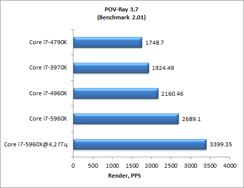 Бенчмарк, встроенный в приложение POV-Ray 3.7, производит рендеринг трехмерных изображений методом трассировки лучей. Результатом данного теста является время рендеринга и среднее количество пикселей, которые рендерятся в секунду (Pixel Per Second, PPS).