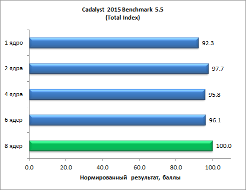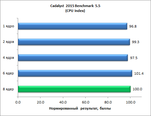 А вот с приложением Autodesk AutoCAD 2015 все оказалось очень грустно. Бенчмарк Cadalyst 2015 не смог выявить преимущество многоядерной архитектуры для данного пакета. Создается впечатление, что приложение Autodesk AutoCAD 2015 является однопоточным.