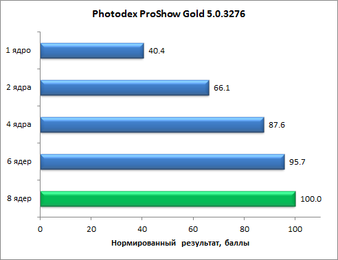 А вот приложение Photodex ProShow Gold, похоже, эффективно может использовать только 4 физических ядра (восемь потоков) процессора. Дальнейшее увеличение числа ядер мало отражается на производительности в этом приложении. К примеру, переход от четырех к шести ядрам дает прирост производительности всего в 9%, а переход от шести к восьми ядрам — 4,5%.