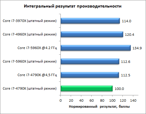 Процессор Core i7-5960X мы протестировали в двух режимах: штатном и в разгоне. Кроме того, для сравнения мы также протестировали шестиядерные процессоры Cоre i7-4960X (Ivy Bridge-E) и Сore i7-3970X (Sandy Bridge-E). И для полноты картины мы добавили четырехъядерный процессор Core i7-4790K (Devil’s Canyon), который был протестирован в штатном режиме и в режиме разгона до частоты 4,5 ГГц. Результаты всех тестов нормировались относительно процессора Core i7-4790K в штатном режиме работы, при этом результаты Core i7-4790K для удобства принимались за 100 баллов.