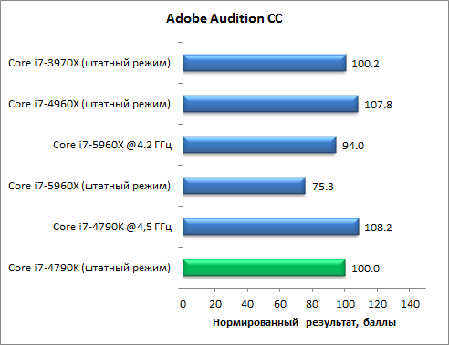 В тесте c использованием приложения Adobe Audition восьмиядерный процессор Core i7-5960X потерпел фиаско. В штатном режиме работы он продемонстрировал производительность на 25% ниже, чем Core i7-4790K, и даже разгон до частоты 4,2 ГГц не смог поднять уровень его производительности в этом тесте до уровня процессора Core i7-4790K.