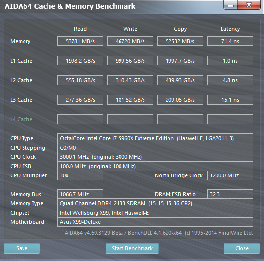 Теперь посмотрим на особенности работы Core i7-5960X в состоянии разгона. Сразу оговоримся, что в состоянии разгона утилита AIDA64 (мы использовали версию 4.60) не способна определить энергопотребление процессора. Причем на это не способна не только AIDA64, но и другие утилиты (например, HWiNFO64 v4.40). По всей видимости, это особенность платы Asus X99-Deluxe: для того чтобы разогнать процессор, в UEFI BIOS необходимо сначала на вкладке Ai Tweaker изменить параметр Ai Overclocker Tuner, задав ему значение Manual. И сразу после этого (даже без фактического разгона) определение энергопотребления процессора с использованием программных утилит становится невозможным.